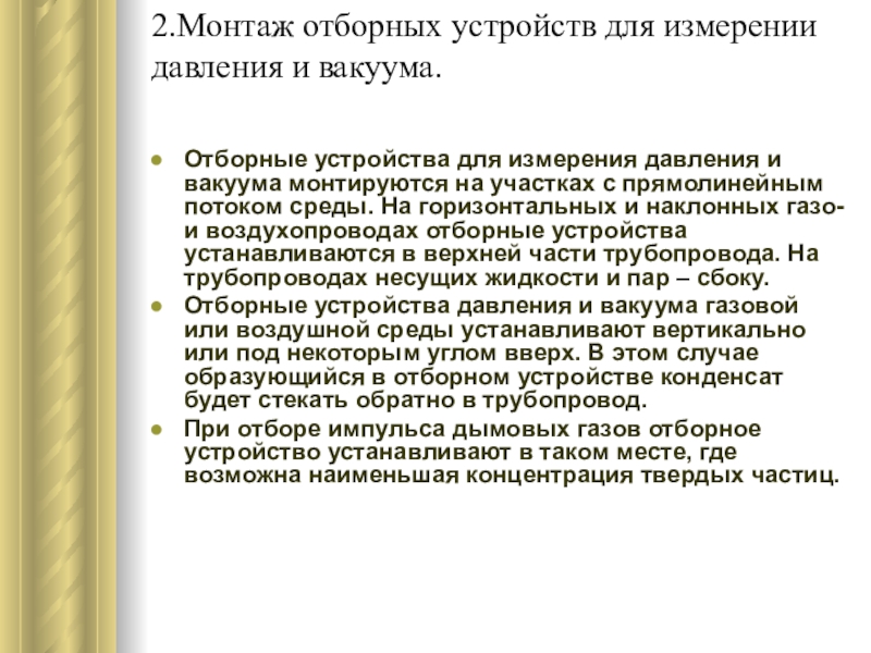 Отборные устройства давления и вакуума газовой или воздушной среды устанавливают вертикально или под некоторым углом вверх. В этом случае образующийся в отборном устройстве конденсат будет стекать обратно в трубопровод.