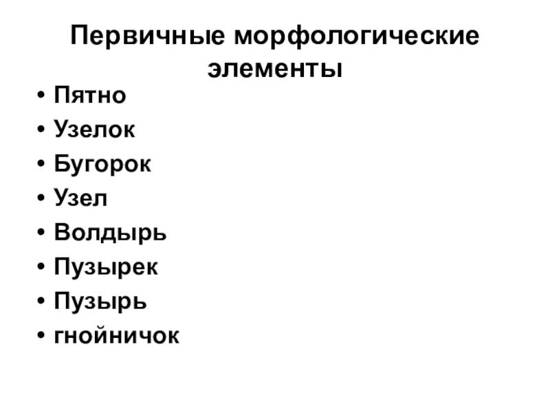Первичные морфологические элементыПятноУзелокБугорокУзелВолдырьПузырекПузырьгнойничок