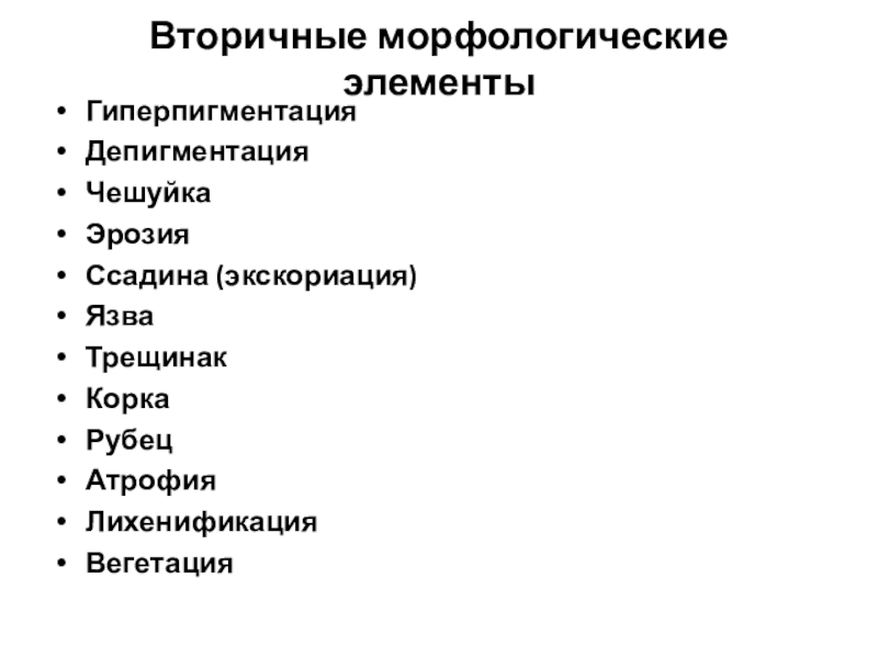 Вторичные морфологические элементы ГиперпигментацияДепигментацияЧешуйкаЭрозияСсадина (экскориация)ЯзваТрещинакКоркаРубецАтрофияЛихенификацияВегетация