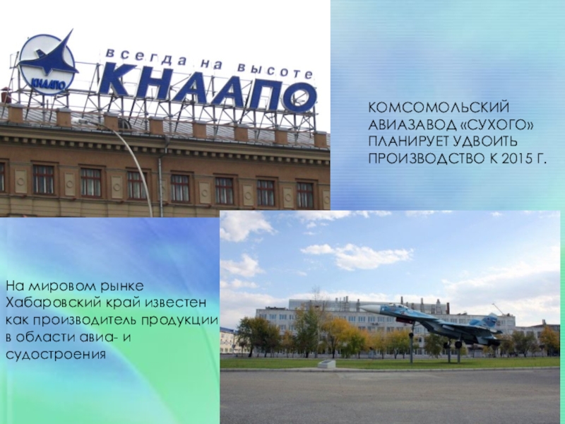 Слайд 24КОМСОМОЛЬСКИЙ АВИАЗАВОД «СУХОГО» ПЛАНИРУЕТ УДВОИТЬ ПРОИЗВОДСТВО К 2015 Г.