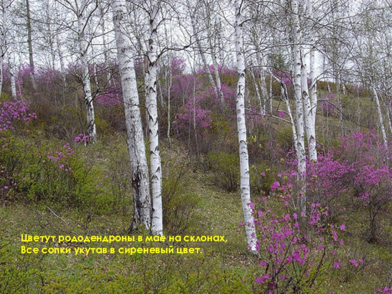 Слайд 40Цветут рододендроны в мае на склонах,