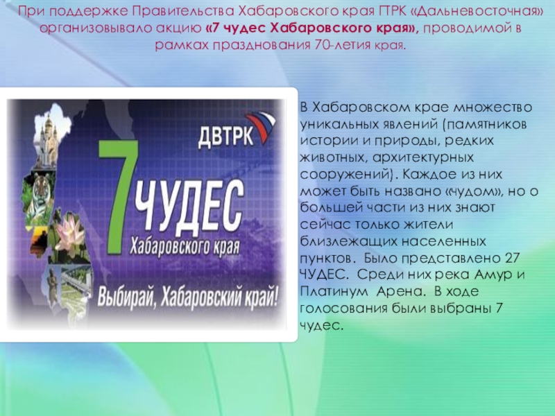 Слайд 26При поддержке Правительства Хабаровского края ГТРК «Дальневосточная» организовывало акцию «7 чудес