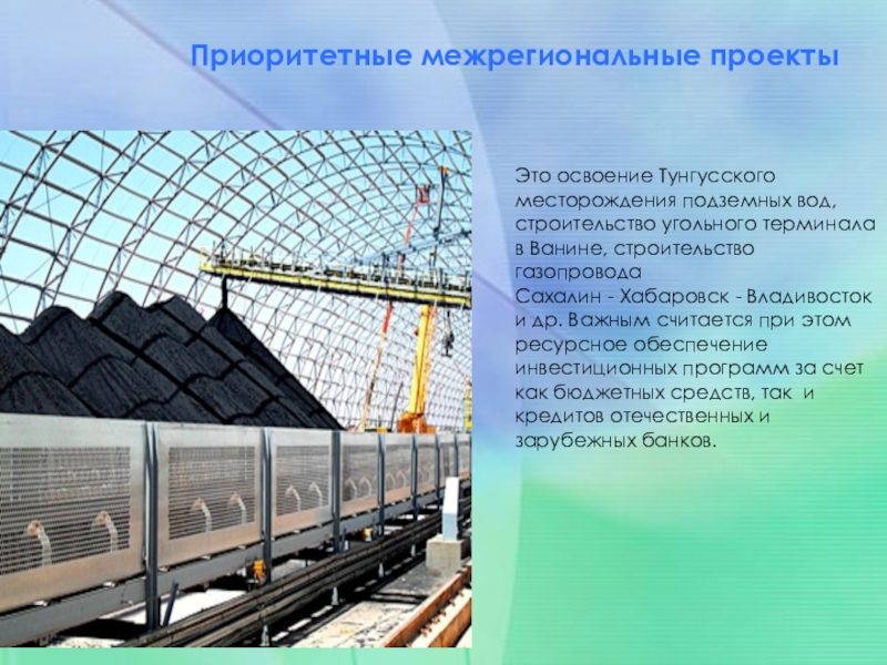 Это освоение Тунгусского месторождения подземных вод, строительство угольного терминала в Ванине,