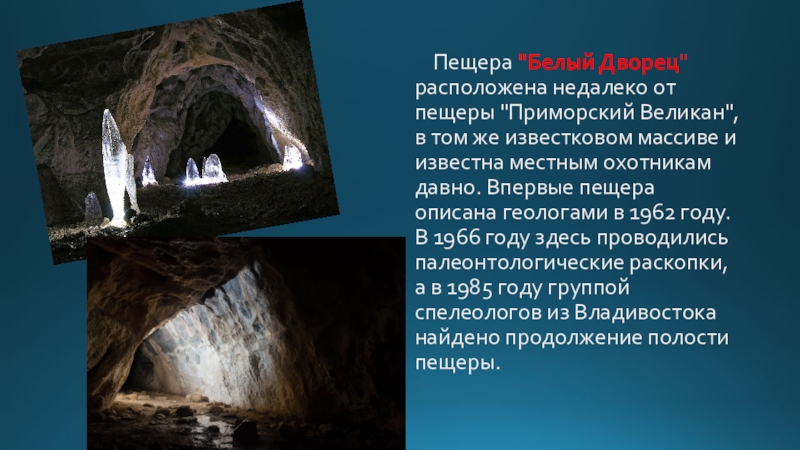 Слайд 37 Пещера "Белый Дворец" расположена недалеко от пещеры "Приморский Великан",