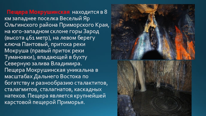 Пещера Мокрушинская уникальна в масштабах Дальнего Востока по богатству и разнообразию сталактитов, сталагмитов, сталагнатов, каскадных натеков. Пещера является крупнейшей карстовой пещерой Приморья.