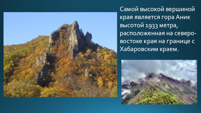 Слайд 6Самой высокой вершиной края является гора Аник высотой 1933 метра, расположенная