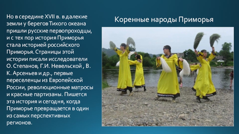 О. Степанов, Г.И. Невельской , В.К. Арсеньев и др., первые переселенцы из Европейской России, революционные матросы и красные партизаны. Пишется эта история и сегодня, когда Приморье превращается в один из самых перспективных регионов.