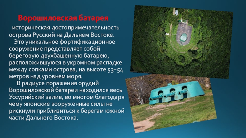 Это уникальное фортификационное сооружение представляет собой береговую двухбашенную батарею, расположившуюся в укромном распадке между сопками острова, на высоте 53−54 метров над уровнем моря.