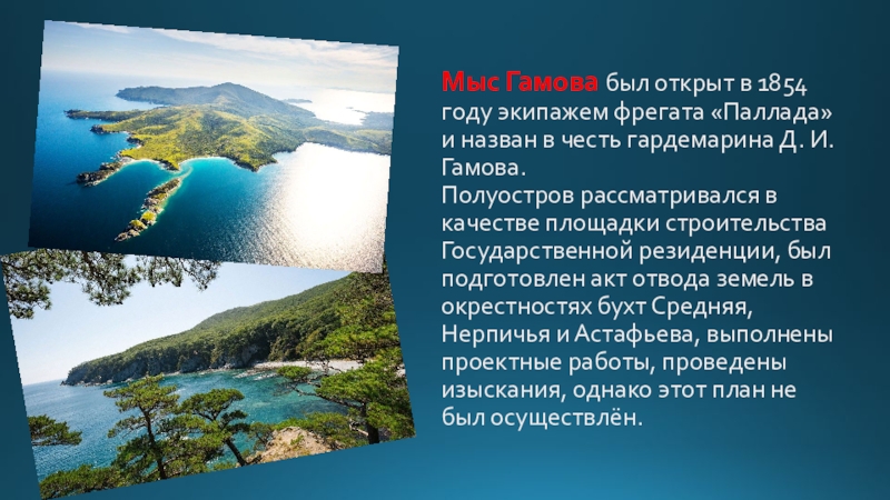 Слайд 40Мыс Гамова был открыт в 1854 году экипажем фрегата «Паллада» и