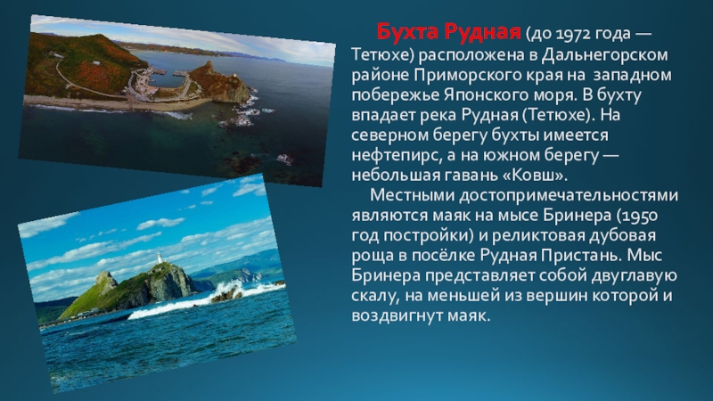 Слайд 33 Бухта Рудная (до 1972 года — Тетюхе) расположена