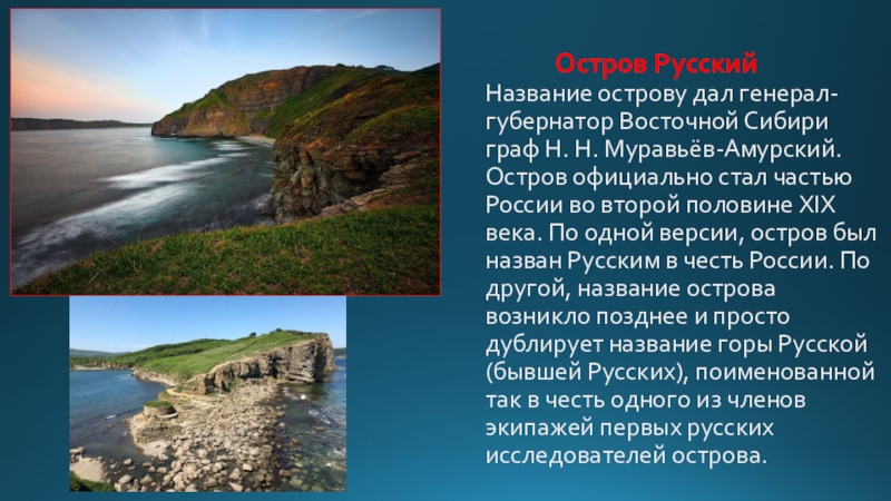 Восточной Сибири граф Н. Н. Муравьёв-Амурский. Остров официально стал частью России во второй половине XIX века. По одной версии, остров был назван Русским в честь России. По другой, название острова возникло позднее и просто дублирует название горы Русской (бывшей Русских), поименованной так в честь одного из членов экипажей первых русских исследователей острова.