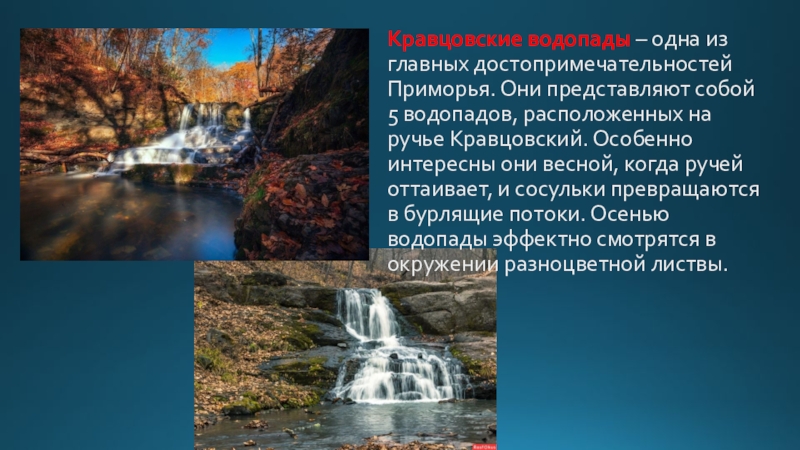 Слайд 39Кравцовские водопады – одна из главных достопримечательностей Приморья. Они представляют собой
