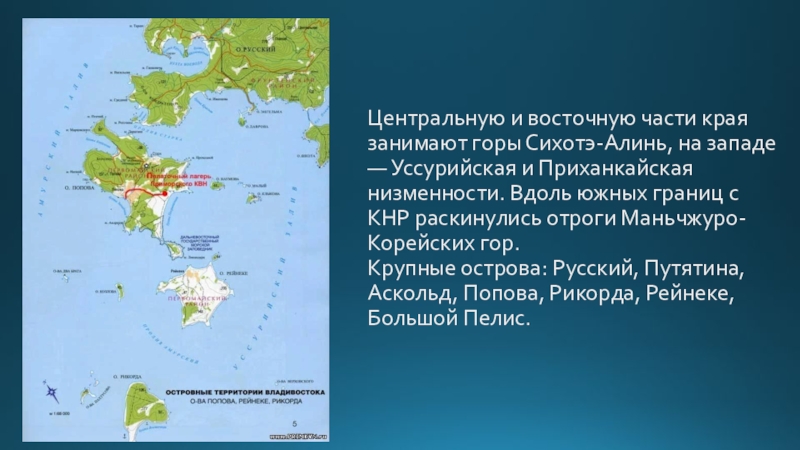 Крупные острова: Русский, Путятина, Аскольд, Попова, Рикорда, Рейнеке, Большой Пелис.