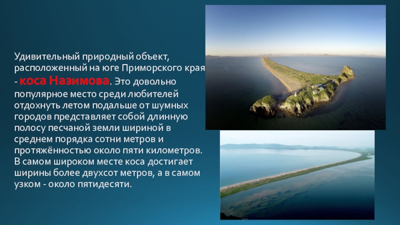 Слайд 34Удивительный природный объект, расположенный на юге Приморского края, - коса Назимова.