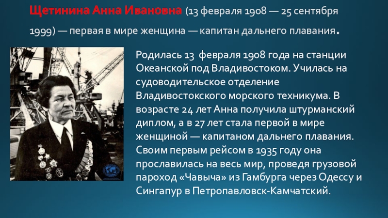 первая в мире женщина — капитан дальнего плавания.