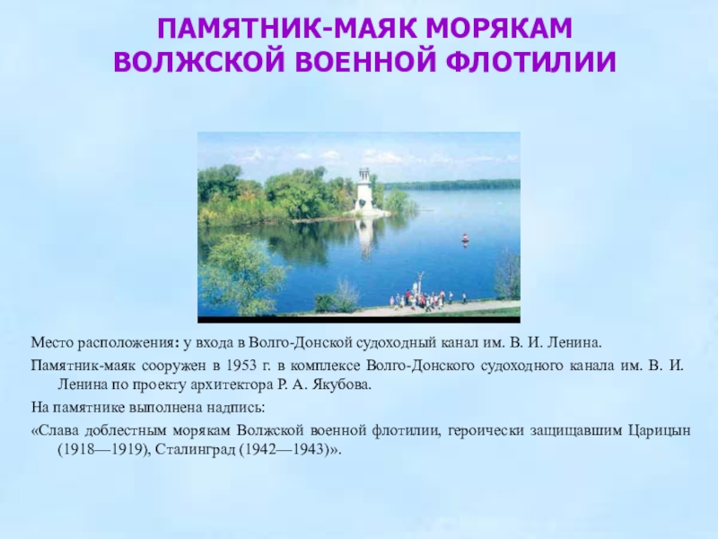 ПАМЯТНИК-МАЯК МОРЯКАМ ВОЛЖСКОЙ ВОЕННОЙ ФЛОТИЛИИ