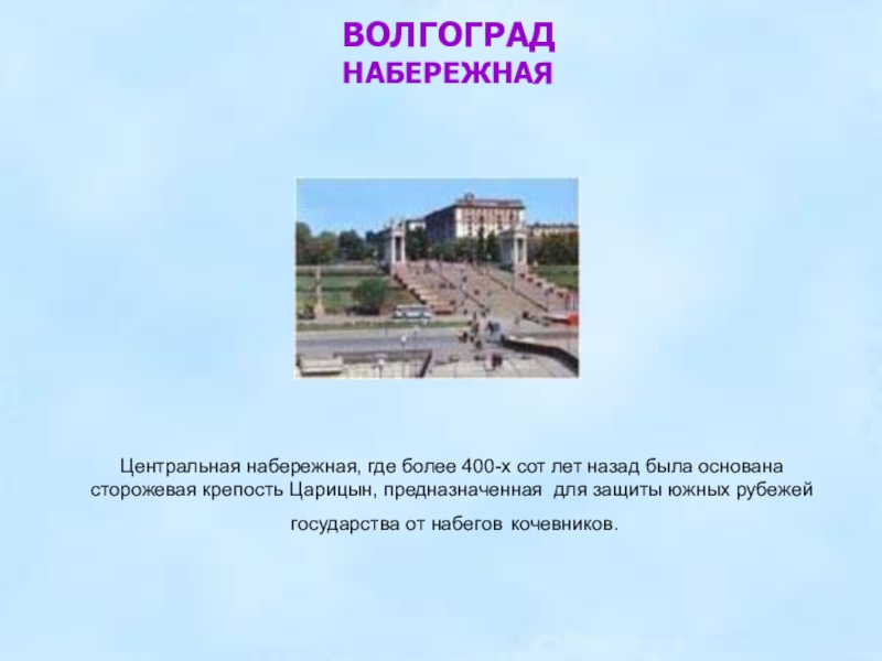 Волгоград основан в 1589 году как сторожевая крепость Царицын при впадении речки Царицы в Волгу. Тогда Царицын был одним из многих городков, которые строило московское правительство царя Фёдора Иоановича в низовьях Волги после покорения Казанского и Астраханского ханств.