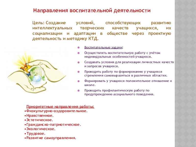 Цель: Создание условий, способствующих развитию интеллектуальных творческих качеств учащихся, их социализации и адаптации в обществе через проектную деятельность и методику КТД.