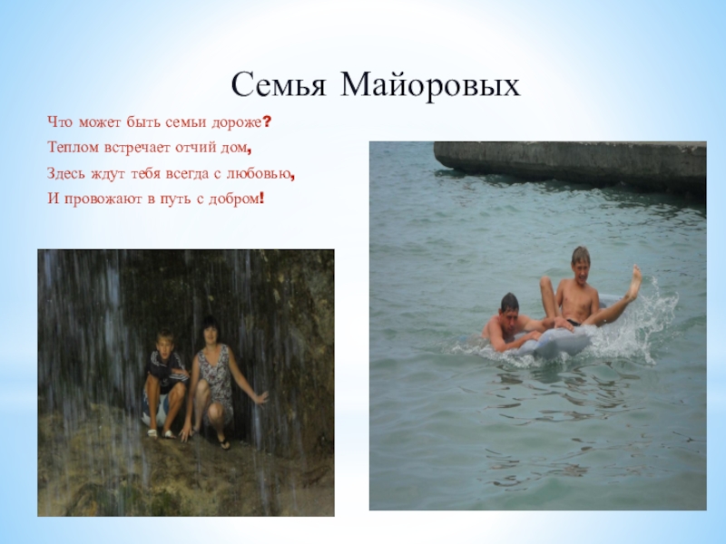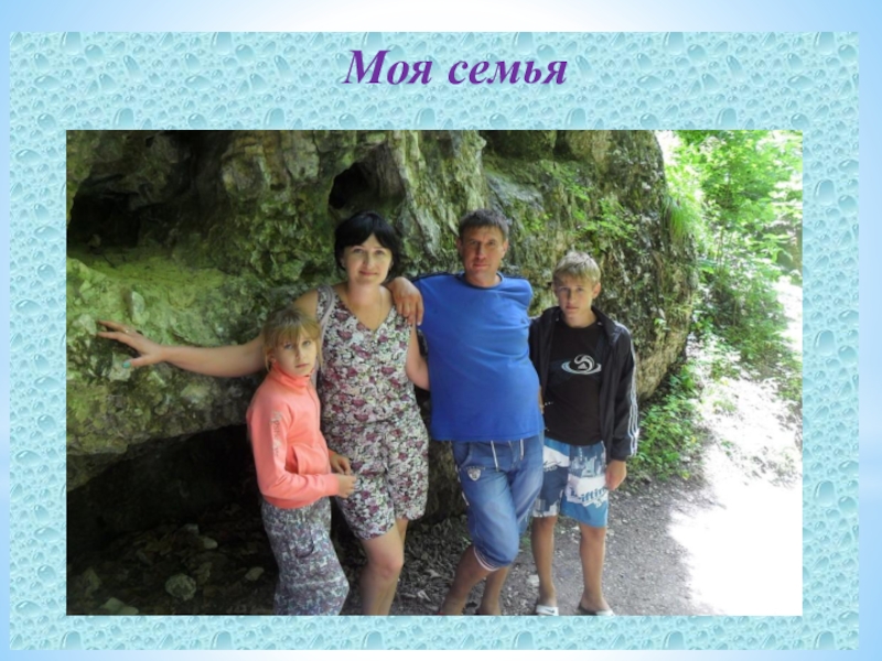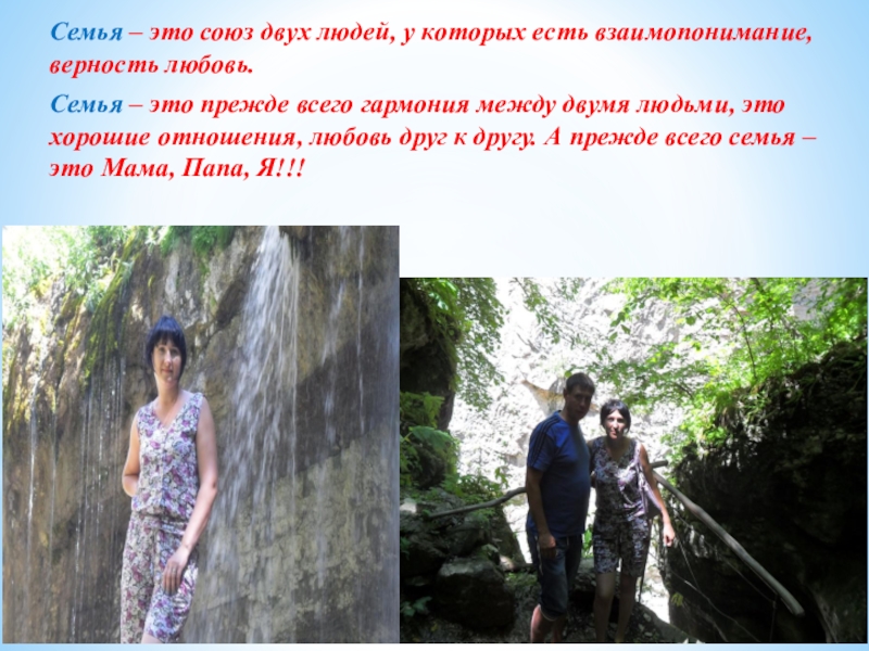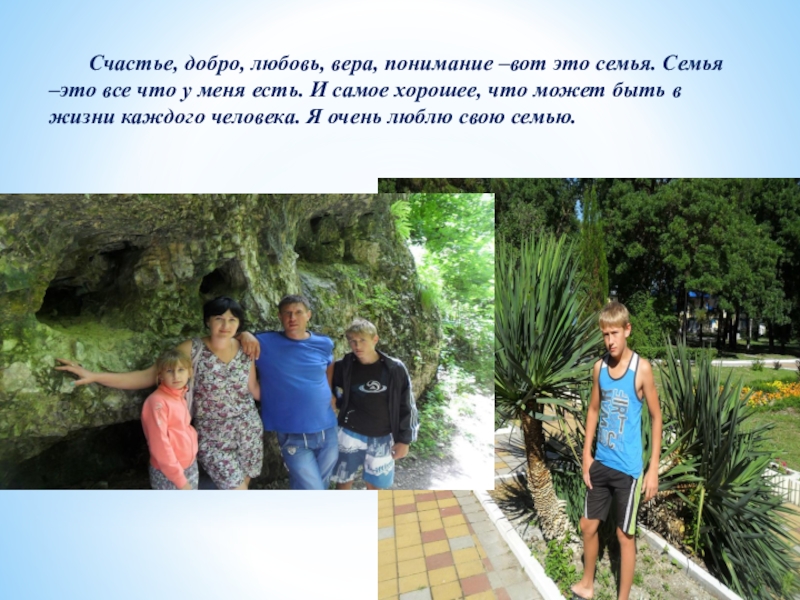 Семья – это группа людей, которые соединены невидимыми родственными узелками. В семье живет всегда счастье, но и иногда бывают и трудные моменты, и тогда на помощь приходит семья. Семью не возможно разлучить. У меня счастливая семья.