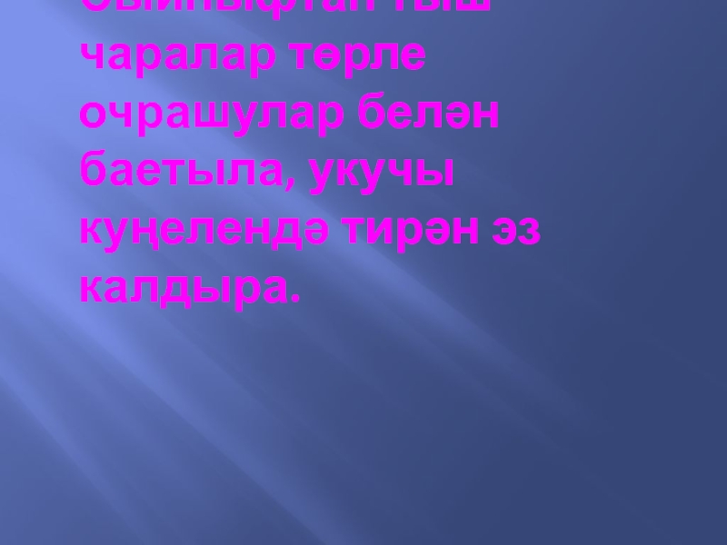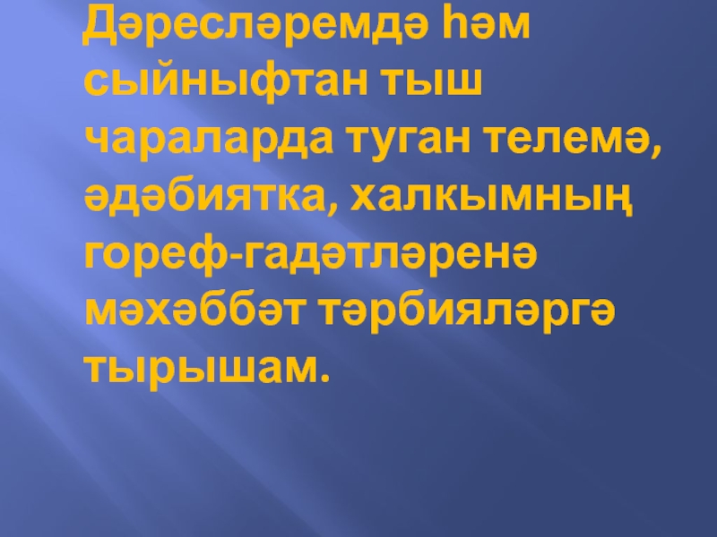 Слайд 2Дәресләремдә һәм сыйныфтан тыш чараларда туган телемә, әдәбиятка, халкымның гореф-гадәтләренә мәхәббәт