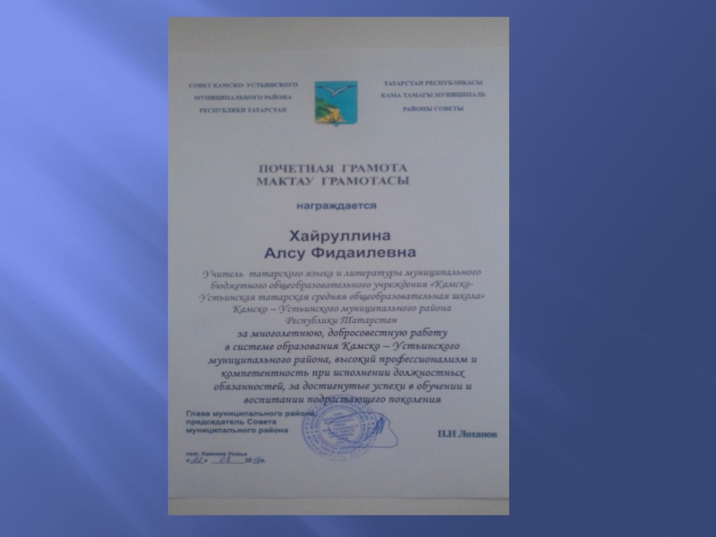 Хәйруллина Алсу Фидаил кызы. Татар теле һәм әдәбияты укытучысы.
