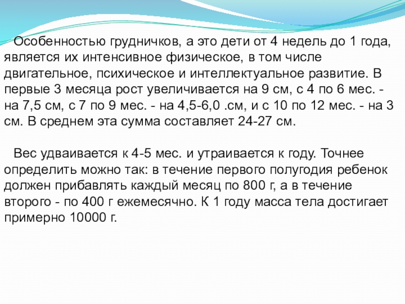 является их интенсивное физическое, в том числе двигательное, психическое и интеллектуальное развитие. В первые 3 месяца рост увеличивается на 9 см, с 4 по 6 мес. - на 7,5 см, с 7 по 9 мес. - на 4,5-6,0 .см, и с 10 по 12 мес. - на 3 см. В среднем эта сумма составляет 24-27 см.