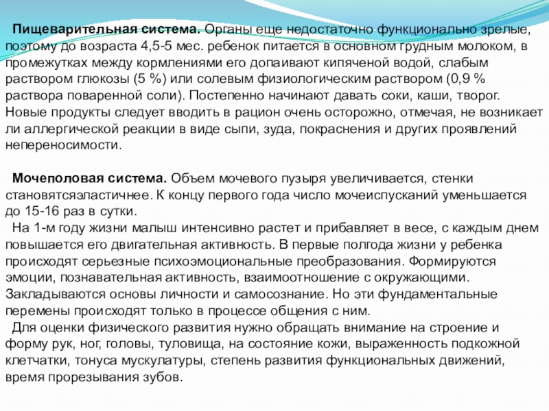 мес. ребенок питается в основном грудным молоком, в промежутках между кормлениями его допаивают кипяченой водой, слабым раствором глюкозы (5 %) или солевым физиологическим раствором (0,9 % раствора поваренной соли). Постепенно начинают давать соки, каши, творог. Новые продукты следует вводить в рацион очень осторожно, отмечая, не возникает ли аллергической реакции в виде сыпи, зуда, покраснения и других проявлений непереносимости.