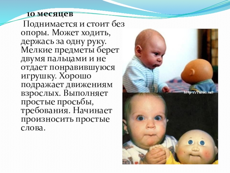 Может ходить, держась за одну руку. Мелкие предметы берет двумя пальцами и не отдает понравившуюся игрушку. Хорошо подражает движениям взрослых. Выполняет простые просьбы, требования. Начинает произносить простые слова.