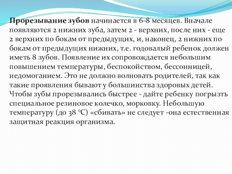 затем 2 - верхних, после них - еще 2 верхних по бокам от предыдущих, и, наконец, 2 нижних по бокам от предыдущих нижних, т.е. годовалый ребенок должен иметь 8 зубов. Появление их сопровождается небольшим повышением температуры, беспокойством, бессонницей, недомоганием. Это не должно волновать родителей, так как такие проявления бывают у большинства здоровых детей. Чтобы зубы прорезывались быстрее - дайте ребенку погрызть специальное резиновое колечко, морковку. Небольшую температуру (до 38 °С) «сбивать» не следует -она естественная защитная реакция организма.