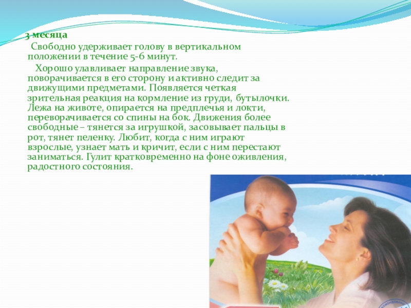 Хорошо улавливает направление звука, поворачивается в его сторону и активно следит за движущими предметами. Появляется четкая зрительная реакция на кормление из груди, бутылочки. Лежа на животе, опирается на предплечья и локти, переворачивается со спины на бок. Движения более свободные – тянется за игрушкой, засовывает пальцы в рот, тянет пеленку. Любит, когда с ним играют взрослые, узнает мать и кричит, если с ним перестают заниматься. Гулит кратковременно на фоне оживления, радостного состояния.