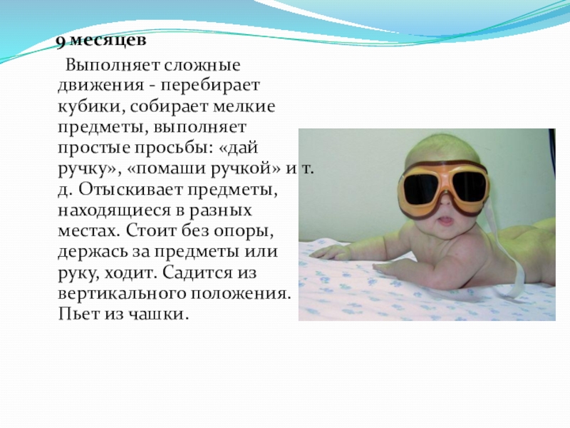 кубики, собирает мелкие предметы, выполняет простые просьбы: «дай ручку», «помаши ручкой» и т. д. Отыскивает предметы, находящиеся в разных местах. Стоит без опоры, держась за предметы или руку, ходит. Садится из вертикального положения. Пьет из чашки.