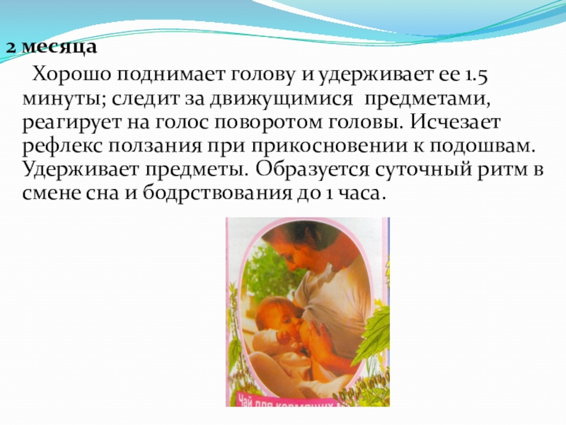 Ребенок начинает фиксировать взгляд на предмете, при появлении чувства голода - плачет, сосет пальцы. При близости материнской груди – поворачивает голову, открывает рот, производит сосательные и глотательные движения.