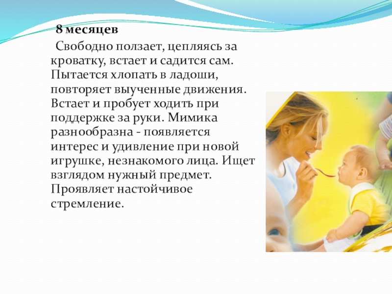 и уверенно, при опоре встает на колени. Поддерживаемый за грудь, хорошо переступает ногами. Тянется к своему изображению в зеркале, с рук на руки перекладывает игрушку . Повторяет «ма»- «ма» и т.д.