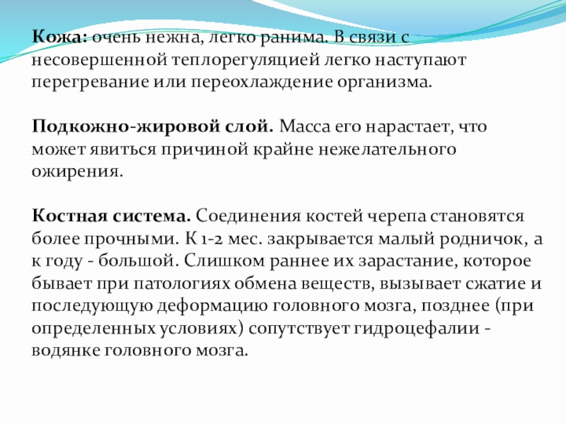 Слайд 3Кожа: очень нежна, легко ранима. В связи с несовершенной теплорегуляцией легко