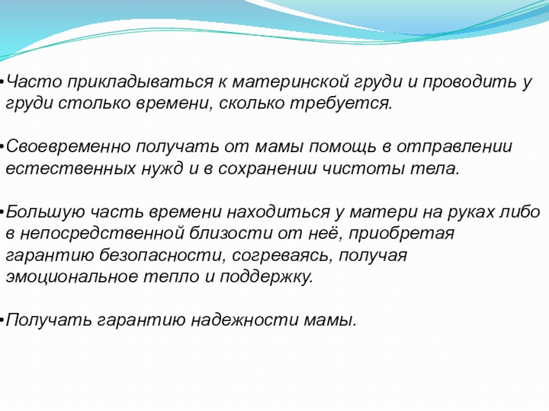 Слайд 24Часто прикладываться к материнской груди и проводить у груди столько времени,