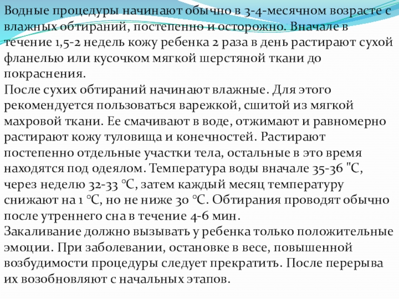Слайд 22Водные процедуры начинают обычно в 3-4-месячном возрасте с влажных обтираний, постепенно