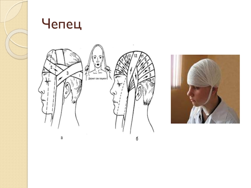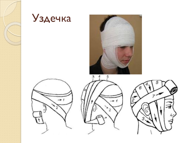 . Она удобна для фиксации перевязочного материала на голове при ранах на выступающих частях: Область носа, подбородка, верхней губы, затылочной области, лобной области.