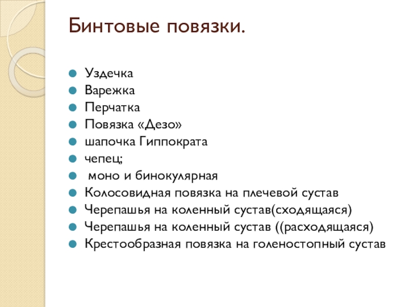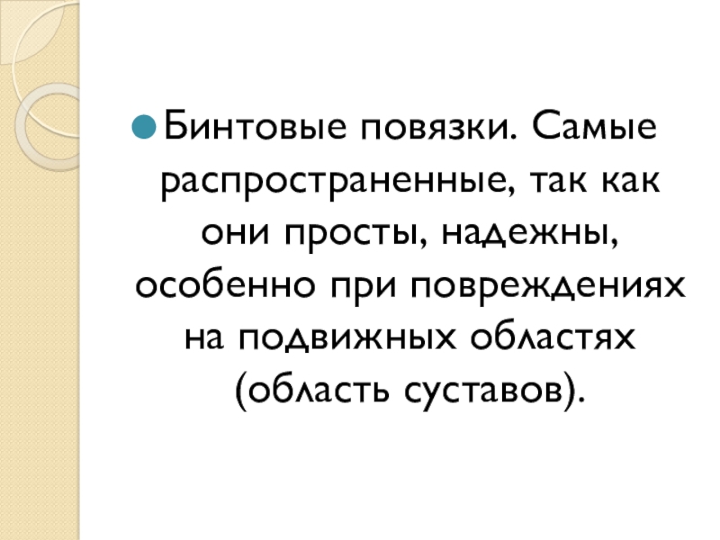 Слайд 18Бинтовые повязки. Самые распространенные, так как они просты, надежны, особенно при