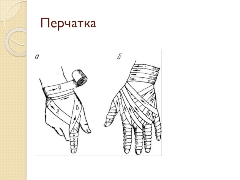 бинтование начинают снизу вверх, бинт развертывают слева направо, при этом правая рука развертывает головку бинта, а левая удерживает повязку и расправляет ходы бинта.