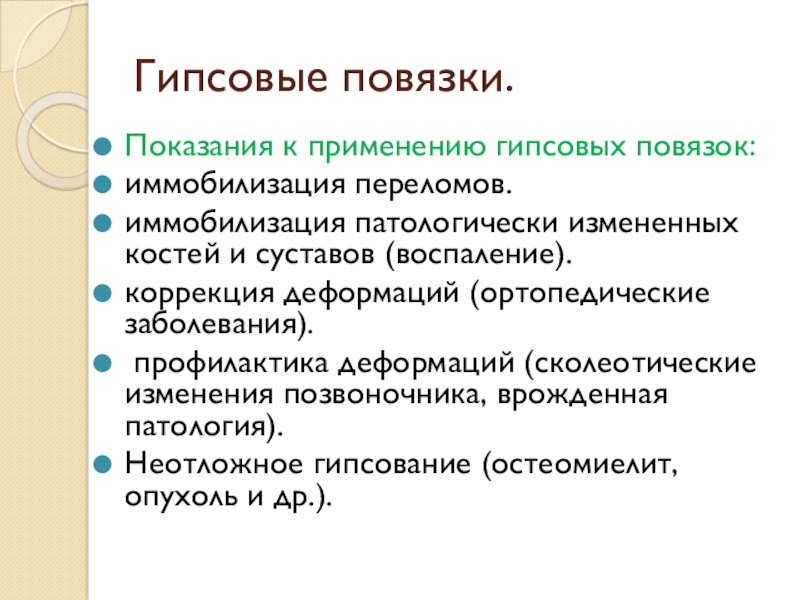 2. Неподвижные иммобилизирующие повязки. Они фиксируют часть тела в определенном положении. Изготавливаются из быстротвердеющих материалов (гипс) или из комбинации мягких (перевязочных) и жестких (шины) материалов.
