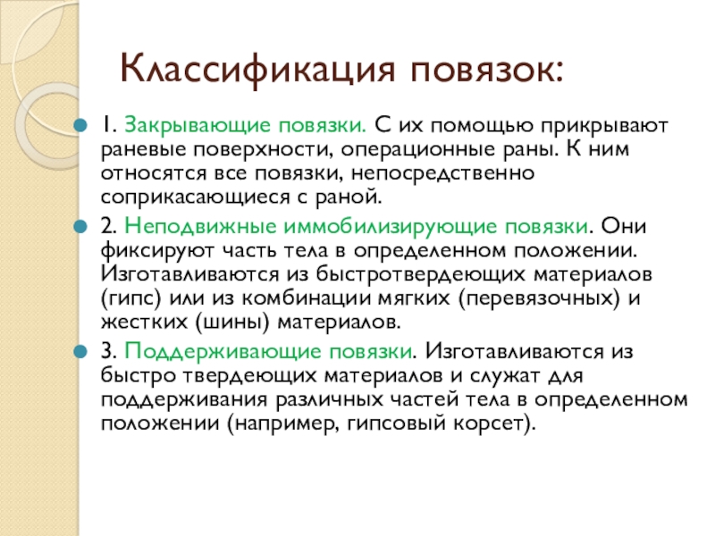 3. Поддерживающие повязки. Изготавливаются из быстро твердеющих материалов и служат для поддерживания различных частей тела в определенном положении (например, гипсовый корсет).