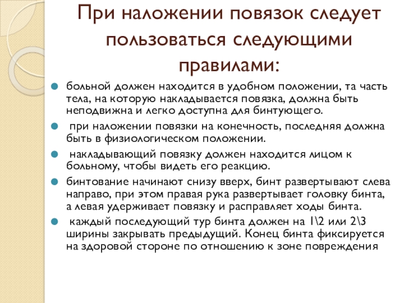 Слайд 30При наложении повязок следует пользоваться следующими правилами:
