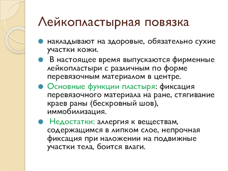 Основные функции пластыря: фиксация перевязочного материала на ране, стягивание краев раны (бескровный шов), иммобилизация.