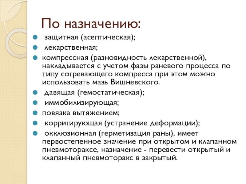 окклюзионная (герметизация раны), имеет первостепенное значение при открытом и клапанном пневмотораксе, назначение - перевести открытый и клапанный пневмоторакс в закрытый.