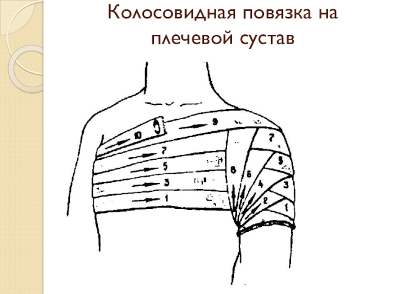 каждый последующий тур бинта должен на 1\2 или 2\3 ширины закрывать предыдущий. Конец бинта фиксируется на здоровой стороне по отношению к зоне повреждения