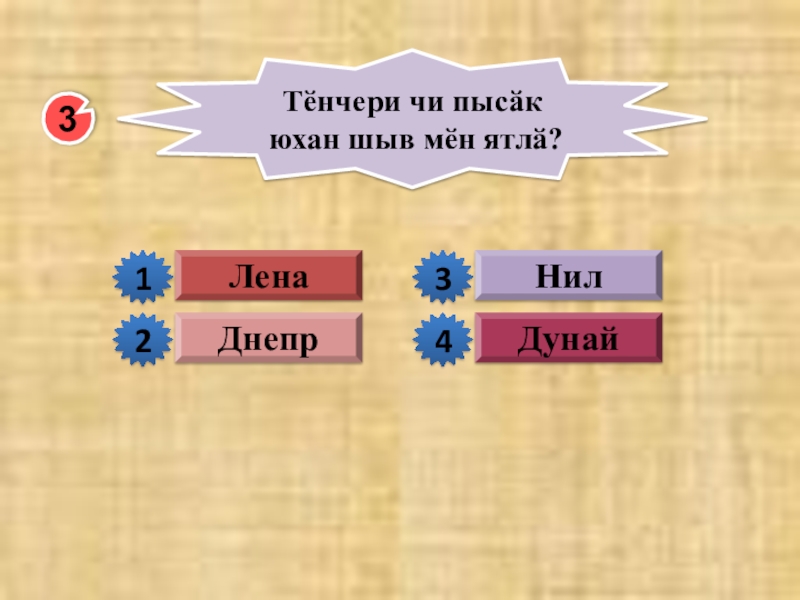 Нил3ДунайТӗнчери чи пысӑк юхан шыв мӗн ятлӑ?ЛенаДнепр2134
