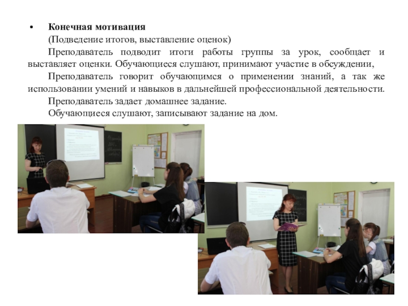 Преподаватель говорит обучающимся о применении знаний, а так же использовании умений и навыков в дальнейшей профессиональной деятельности.
