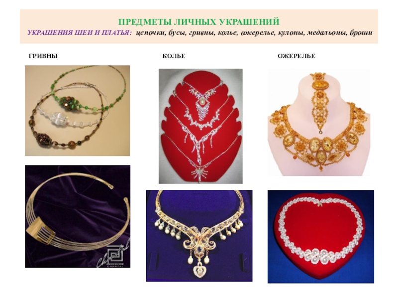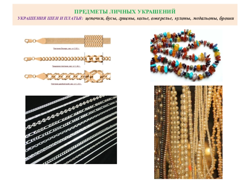 УКРАШЕНИЯ ШЕИ И ПЛАТЬЯ: цепочки, бусы, гривны, колье,