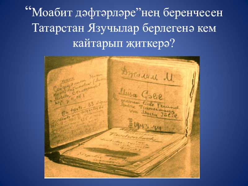 Слайд 14“Моабит дәфтәрләре”нең беренчесен Татарстан Язучылар берлегенә кем кайтарып җиткерә?