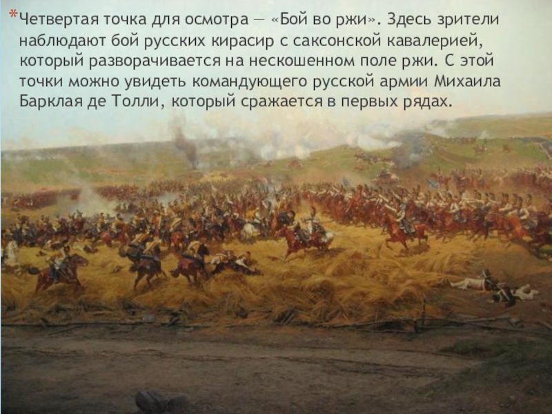 бой русских кирасир с саксонской кавалерией, который разворачивается на нескошенном поле ржи. С этой точки можно увидеть командующего русской армии Михаила Барклая де Толли, который сражается в первых рядах.